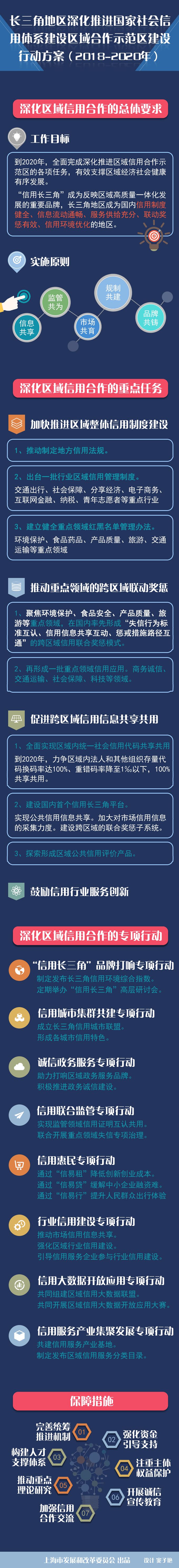 长三角地区是国家发改委批复的全国首个区域信用合作示范区。为进一步深化长三角地区社会信用体系建设合作,共同打响“信用长三角”品牌,营造健康的区域经济社会发展环境,上海市、江苏省、浙江省、安徽省近日联合印发了《长三角地区深化推进国家社会信用体系建设区域合作示范区建设行动方案(2018-2020年)》。