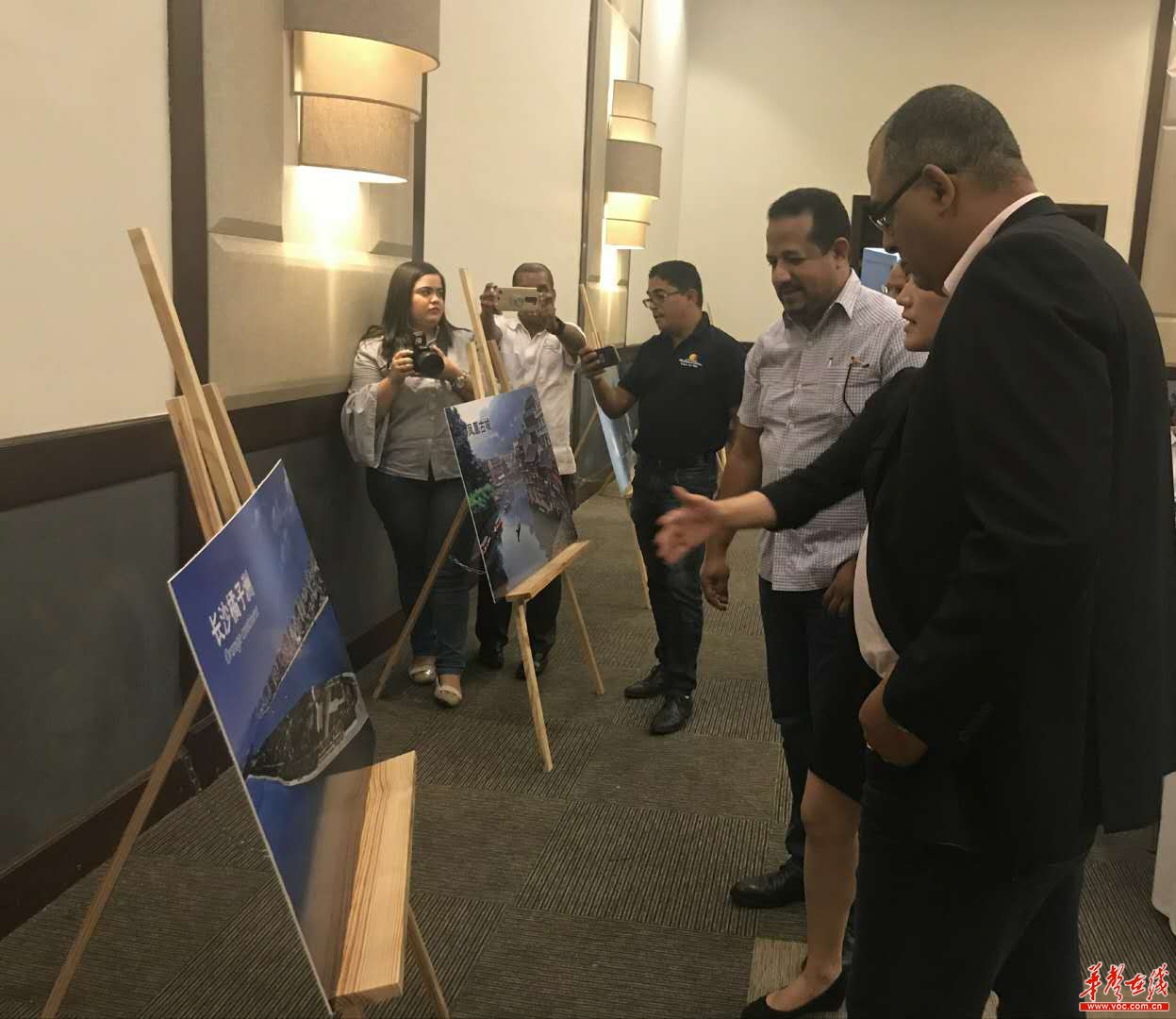 多米尼加嘉宾观看“锦绣潇湘”走进多米尼加——湖南旅游图片展。
