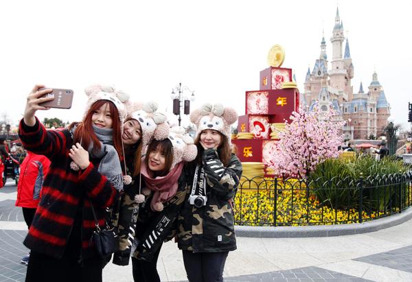2019年2月5日,农历大年初一,游客在上海迪士尼乐园拍照留念。