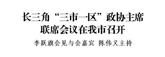 为认真学习习近平总书记在扎实推进长三角一体化发展座谈会上的重要讲话精神,交流长三角“三市一区”政协工作,助推长三角一体化高质量发展,9月7日,长三角“三市一区”政协主席联席会议在我市召开。上海普陀区政协主席钱城乡、江苏盐城市政协主席李驰、安徽黄山市政协主席路海燕和我市政协主席陈伟义出席会议。会前,市委书记李跃旗会见与会嘉宾。