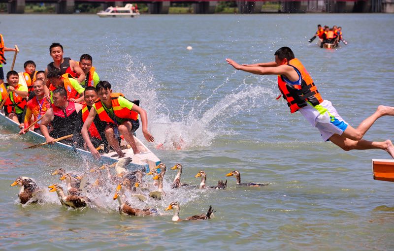 龙舟赛后的抢鸭子大赛,将整个活动再一次推向高潮。活动现场,工作人员将200只鸭子抛入空中,嘎嘎叫着扑腾到水面,伴随急促的锣鼓声,划桨者奋力击水,18支龙舟队员代表分坐5支龙舟围追堵截,鸭子扑打着翅膀纷纷逃避。只见龙舟队员们跪蹲在船头,双眼凝视着“猎物”,船一靠近目标,便眼疾手快跃入水中。最终“头鸭”被眉山市龙舟队收入囊中,博得沿岸观众阵阵欢呼。