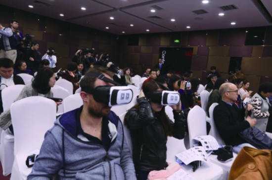 图为参会人员戴上VR眼镜看贵阳。 本报记者 王京 摄