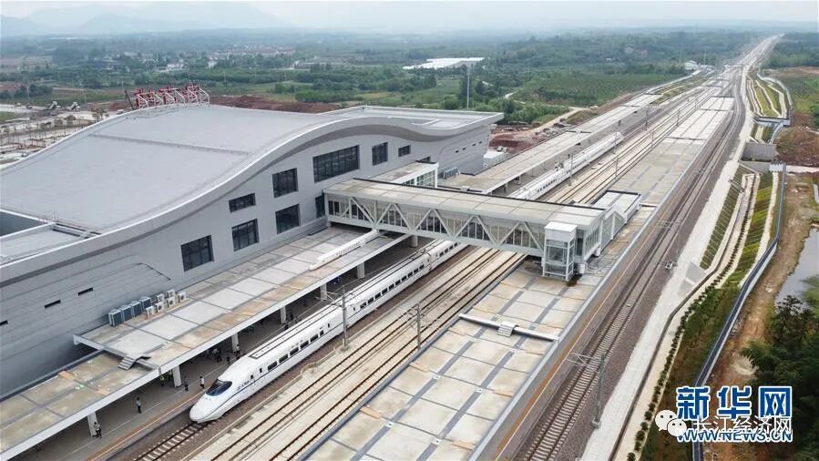 试运行检查确认列车停靠在商合杭高铁安吉站(5月27日摄,无人机照片)。