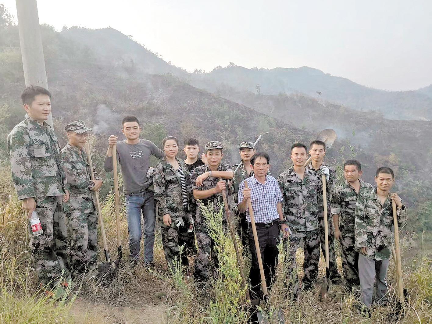 2019年清明节,陶家坊发生山林火灾,刘水存(右五)和村民兵应急分队队员一起扑救完山火后留影。(图片由刘水存家人提供)