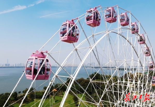 “东湖之眼”摩天轮是今年新添的网红打卡点,樱花粉座舱在墨绿山水间慢慢旋转,一圈下来刚好13分14秒,转到高处可俯观东湖,成为许多游客长假打卡的首选,更有外地游客专程前来。摩天轮入口处排起长龙,游客王祖鸣告诉记者:“听说一圈时长13分14秒,所以专程带女友来体验,既可以换个角度赏东湖,又希望博个好彩头。”
