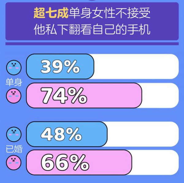 感情生活里,不少人想着时刻了解对方的动向,却很容易引起对方的抵触。从《报告》可以看出,53%的男性不接受恋人要求自己秒回信息;而高达77%的女性对这样的要求直接说“不”!