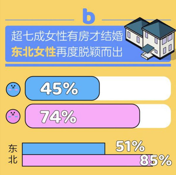 这方面,东北地区再次位居全国首位。高达85%的东北女性认为“结婚之前必须要拥有自己的房子”,这与过半数的东北男性观念不谋而合,51%的东北男性也只接受买房结婚,数据亦高于全国其他地区的男性比例。