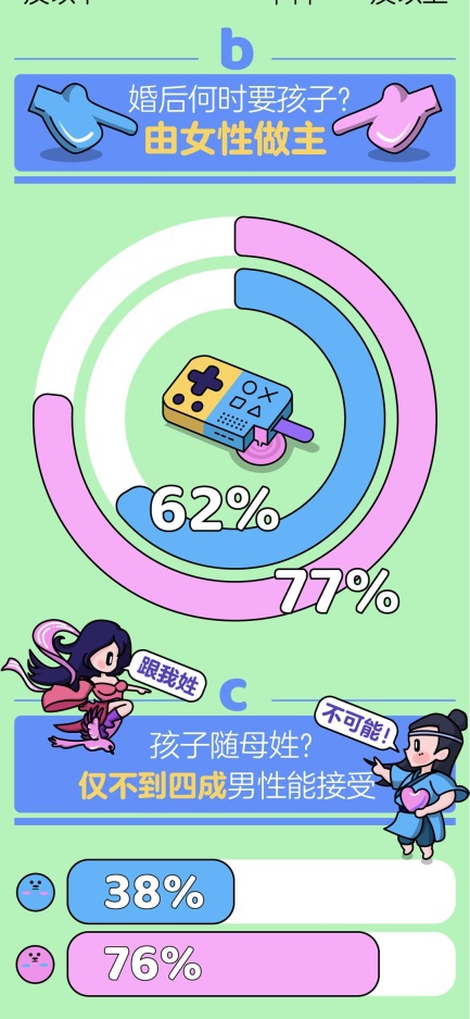 虽然,在生孩子这件事情上,男性不断让步,但涉及到孩子应该随谁姓时,大多数男性都不愿妥协。《报告》显示:76%的女性可以接受孩子随母姓,但仅有38%的男性愿意接受。