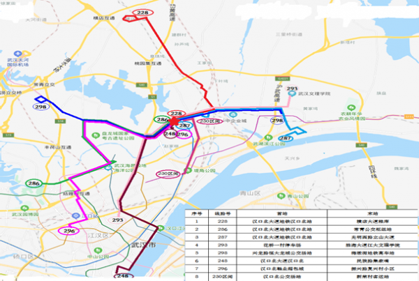 296路:首末站由汉口北鞋业箱包城至振兴路复兴村小区,线路走向为:汉口北大道、巨龙大道、盘龙大道、金银潭大道、将军一路、姑嫂树路、新湾路、新湾五路、发展大道、振兴东路、振兴路,单程线长23.59公里,配车26台。线路连接在轨道2、3号线宏图大道站。