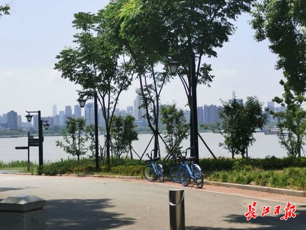 8日上午,武昌江滩上,停放着几辆共享单车。记者刘海锋摄