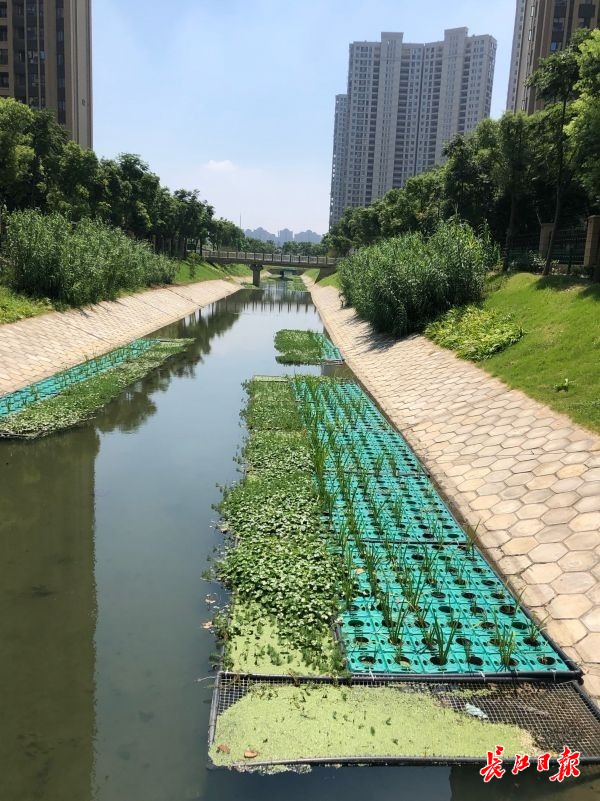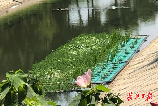 由北向南,记者顺着河道一路朝塔子湖明渠下游方向前行,沿岸已经被各色绿植染绿。仔细观察,可发现水中有小鱼若隐若现。每隔一段,就会遇见一处生态浮岛,“浮岛”上种满了花花草草。草是绿的,水生鸢尾是红的和紫的,点缀得明渠葱葱郁郁。明渠两侧,六角块铺就的护坡整洁美丽。岸上还有维护人员在清理杂草和垃圾。