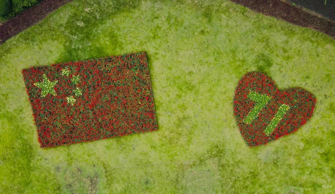东湖梨园入口处用时令花卉摆放出五星红旗和数字71的形状。