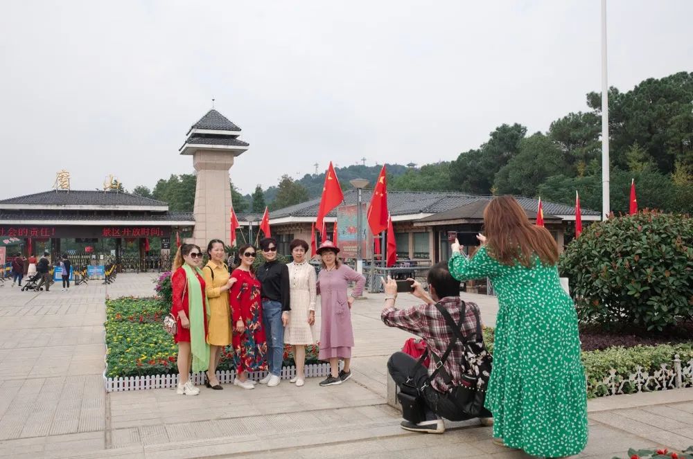 在磨山南门、梅园正门,以紫色、粉色的三角梅为主的花卉景观,吸引了从鄂州来武汉游玩的田先生一行,只见同行的阿姨们在花卉前摆弄着手里的绿丝巾,婀娜多姿。