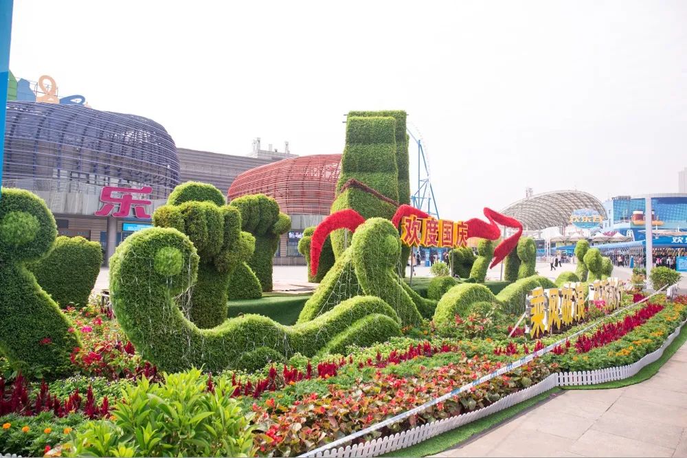 欢乐谷前广场以“乘风破浪”为主题摆放立体花坛。