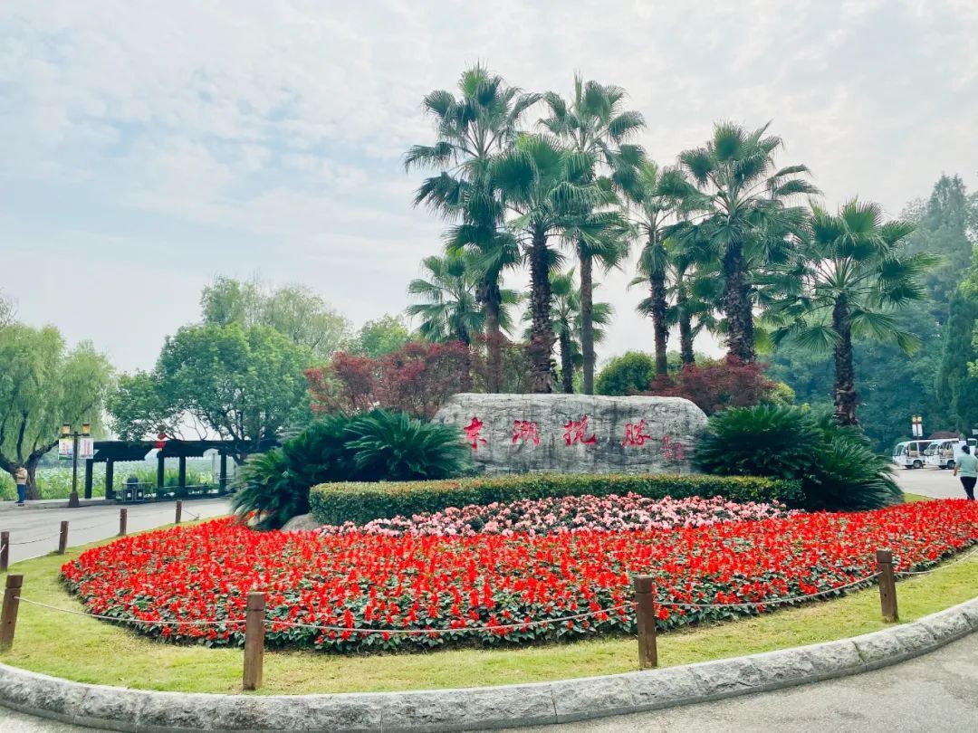 在东湖老大门,一串红搭配西洋鹃、红叶石楠、铁树、红枫树,以及高大的棕榈,再配上“东湖揽胜”景观石吸引不少游客驻足拍照。