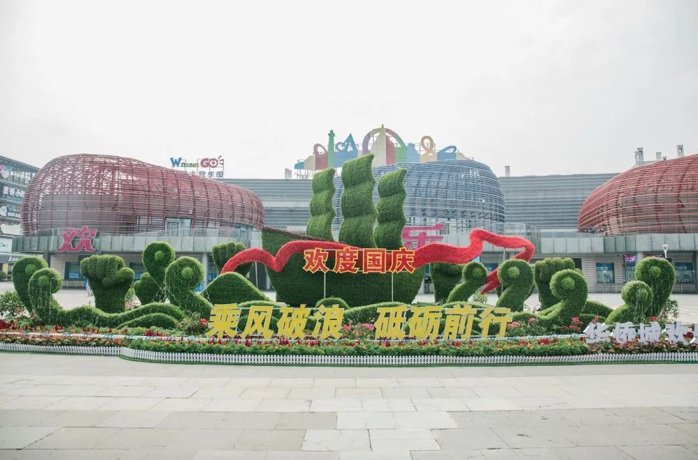 武汉欢乐谷前广场的立体花坛以“乘风破浪”为主题,用绿植包裹出船、波浪、拳头的形状,再在周围摆放凤尾、秋海棠、孔雀草、茉莉等植物。