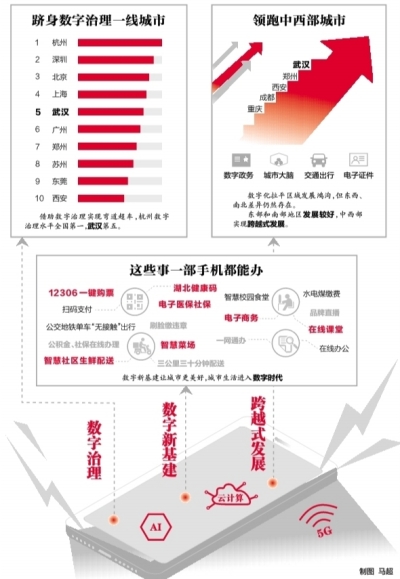 报告显示,武汉、郑州、西安等中西部城市实现跨越式发展,成为数字治理一线城市。其中,武汉领跑中西部城市,率先受益数字化,实现城市跨越式发展。