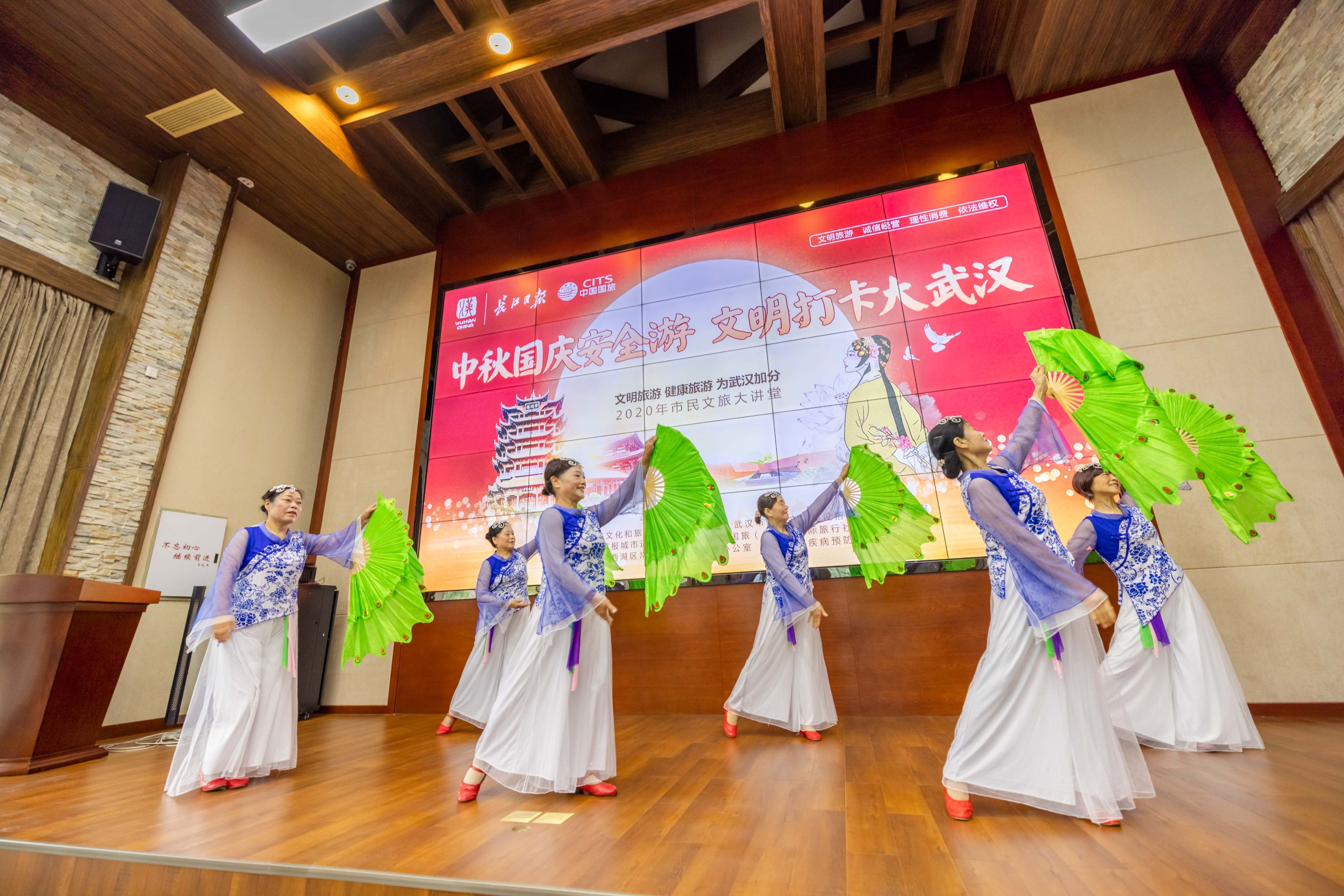 常青花园社区表演队在武汉市民文旅大讲堂上表演扇子舞,倡议文明打卡大武汉。吴连珠提供