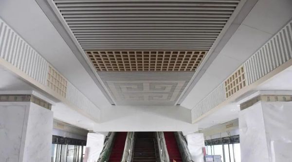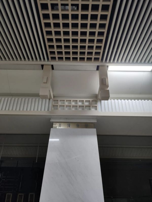 大厅天花板上,采用浅色的铝板拼接,用条纹状的板材拼接处的抽象荆楚花纹,与立柱的风格形成呼应,展示历史的韵味。