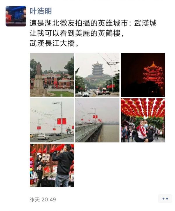 叶浩明把群友们分享的武汉美景,转发到自己的朋友圈,注明了武汉摄友拍摄,他告诉记者,“我没有去过武汉,但我一定会去亲自感受一下这座英雄的城市!”