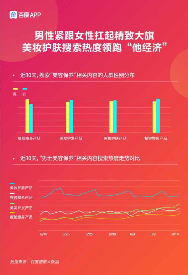 而与传统认知相反,百度搜索大数据显示,男性超前消费心理已超女性。男性对“瘦脸瘦身产品”相关内容的搜索热度已反超女性,对“美妆护肤产品”的关注也几乎追平女性。