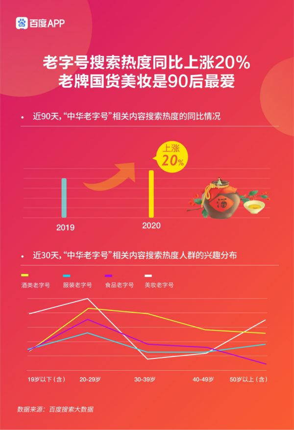 数据显示,近90天,“中华老字号”相关内容搜索热度较去年同比上涨20%。随着越来越多的国货老字号开启“年轻化”之路,拥抱互联网和电商,90后也成为最关注“中华老字号”相关内容的群体,而他们最关注的品类则是老牌国货美妆。