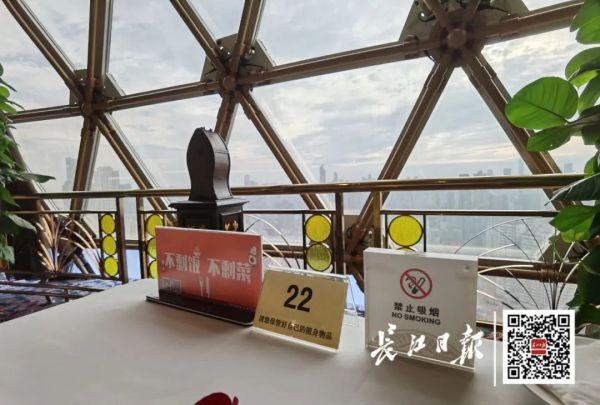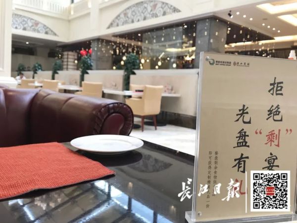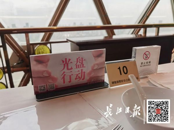 中午1时,在江城明珠豪生大酒店西餐厅、中餐厅、41楼餐厅等多个餐厅,每张桌子上都摆放了“节俭用餐”“光盘行动”等温馨提示牌,倡导顾客更加文明节俭的用餐。