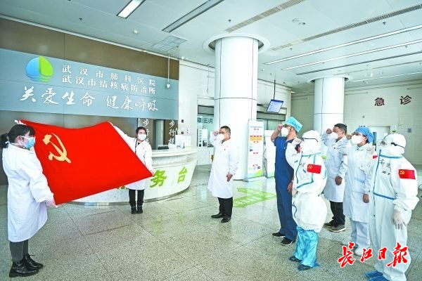 战疫期间,武汉市肺科医院抗疫一线的杜荣辉、胡明、郭光云、秦立新、龚道敏等5位医护人员宣誓入党 记者胡冬冬 通讯员王敏 摄
