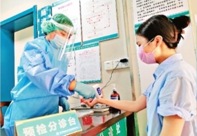 记者看到,预检分诊护士和值班医生都穿着防护服、鞋套,戴着N95口罩、帽子、手套。“夏天穿着防护服就像蒸桑拿一样。”值班医生王佳说,好多人都捂出了一身的痱子。“不过无论多么难受,我们都会站好岗,继续强化发热哨卡监测,坚决不漏掉一个疑似病人。”