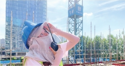 在2楼操作平台上,钢筋工闫大军、宋满满戴着厚厚的手套,正在有条不紊地绑扎钢筋,两人脸上豆大的汗珠直往下滴。不远处,塔吊指挥员黄亚娜站在平台上,仰望高空,拿着对讲机指挥塔吊司机吊装钢筋等建筑材料。为了防暑,她“全副武装”,不仅戴了作业必备的安全帽,还特意戴了防晒帽,在脖子上围了防晒围巾,手臂穿上防晒袖套。“塔吊起吊、装卸材料过程中,我必须在现场时刻盯着,所以要做好防晒防暑措施。”她说。