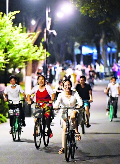 1日晚,东湖绿道上夜骑、夜跑的健身运动爱好者成群结队,凉爽的湖风和绚丽的夜景吸引了众多市民来此纳凉打卡。 长江日报记者高勇 摄