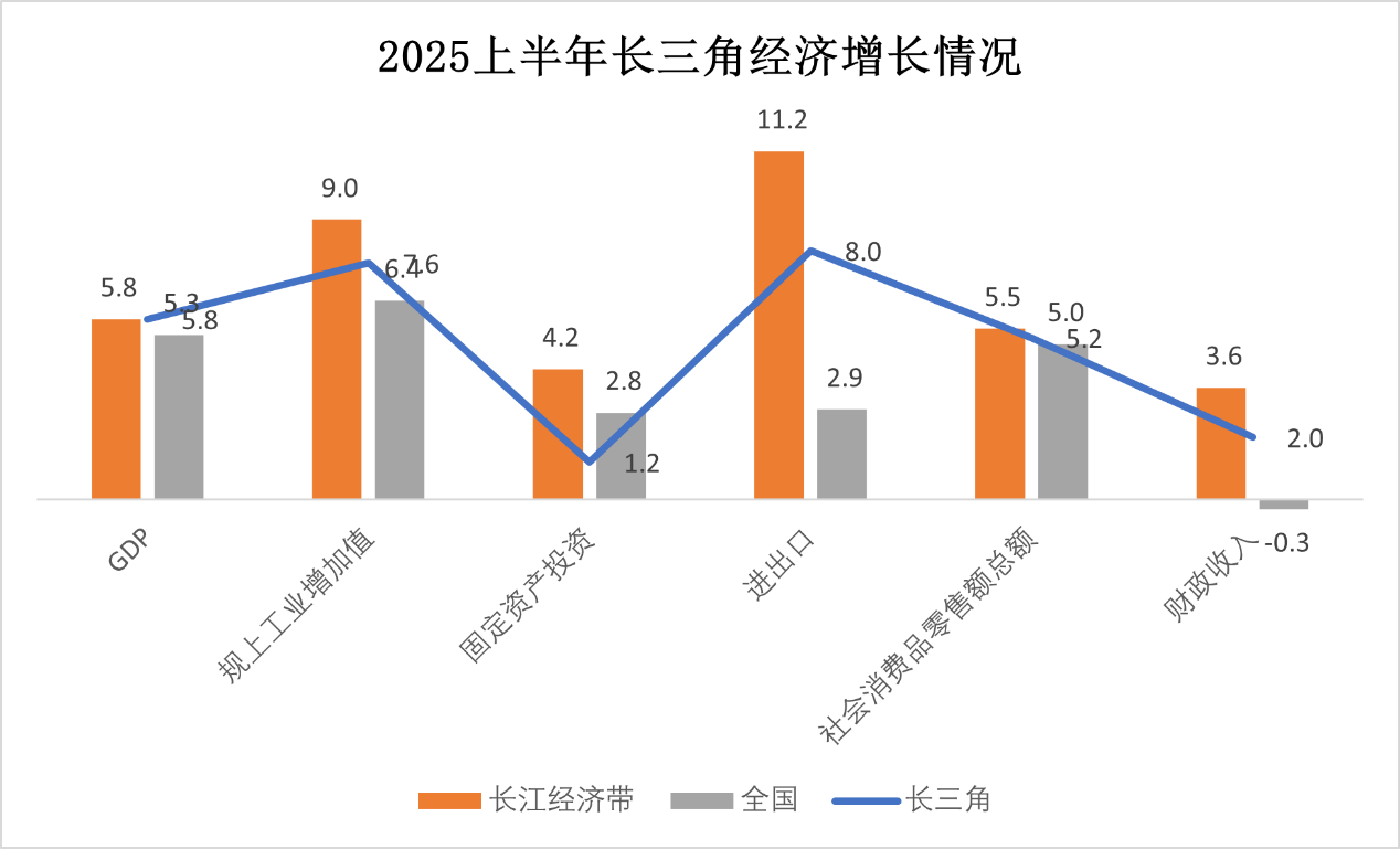 根据各地统计局进度数据,2025年上半年长三角城市41城市GDP总体增速为5.8%,与长江经济带持平,比全国高0.5个百分点;其中,舟山(6.9%)GDP增速最高。共20个城市GDP增速低于长三角总体增速:上海(5.1%)、南京(5.3%)、无锡(5.3%)、苏州(5.7%)、连云港(5.0%)、扬州(5.7%)、泰州(5.7%)、杭州(5.7%)、宁波(5.1%)、嘉兴(5.2%)、衢州(5.5%)、淮北(3.4%)、亳州(5.5%)、宿州(5.0%)、蚌埠(5.6%)、阜阳(5.6%)、淮南(4.0%)、滁州(5.3%)、六安(5.5%)、池州(5.6%),GDP增速相对落后。