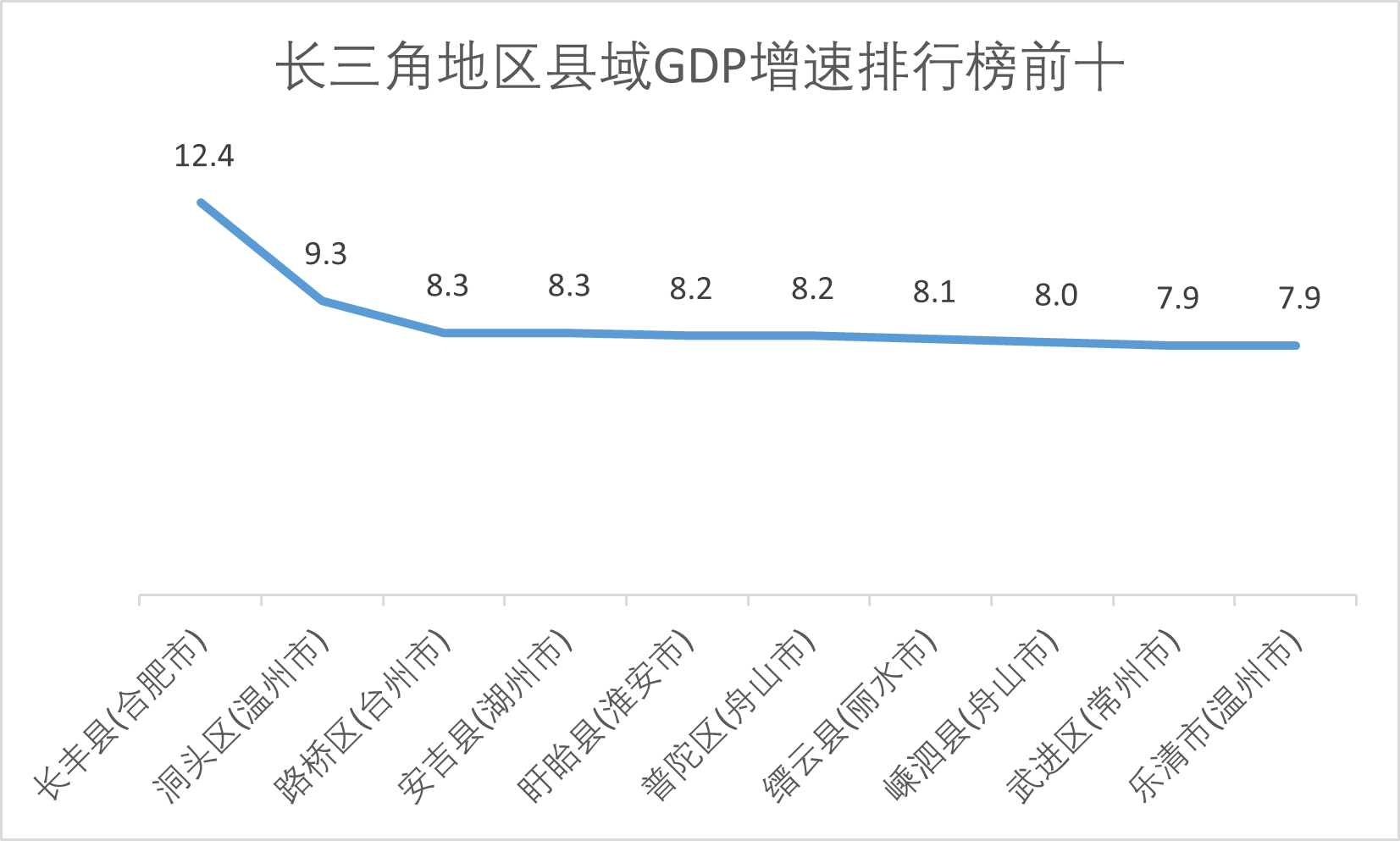 从整体来看,长三角地区县域GDP增速排行榜前十分别是:合肥长丰县(12.4%)、温州洞头区(9.3%)、台州路桥区(8.3%)、湖州安吉县(8.3%)、淮安盱眙县(8.2%)、舟山普陀区(8.2%)、丽水缙云县(8.1%)、舟山嵊泗县(7.9%)、常州武进区(7.9%)、温州乐清市(7.9%)。