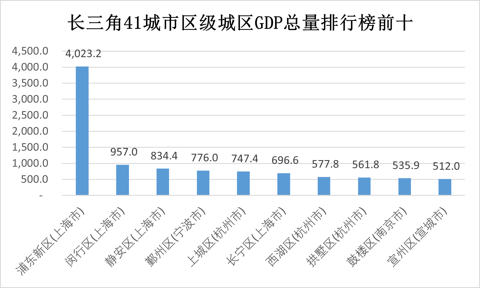 从整体来看,长三角41城市区级城区中,GDP总量排行榜前十分别是:上海浦东新区(4,023.2亿元)、上海市闵行区(957.0亿元)、上海市静安区(834.4亿元)、宁波市鄞州区(776.0亿元)、上杭州市上城区(747.4亿元)、上海市长宁区(696.6亿元)、杭州市西湖区(577.8亿元)、杭州市拱墅区(561.8亿元)、南京市鼓楼区(535.9亿元)、宣城市宣城区(512.0亿元)。
