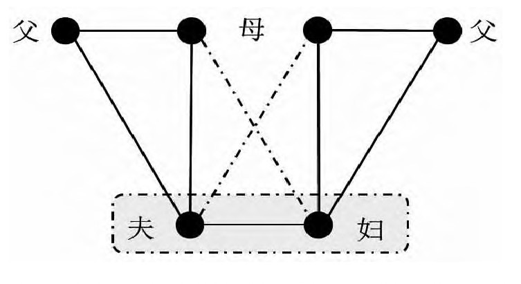 从关系类型学来看,图4的示意图由双方原生家庭父母与夫妇之间共同组成了两组平行四边形关系,如果夫妻关系和谐,那么由夫妇婚姻子系统与父母构成了两组三角关系,相对而言较为稳定;如果夫妻关系不稳定,那么平行四边形的伸缩性就会出现。而且,由于父—母—夫和父—母—妇两组亲子关系在长久抚育过程逐渐形成了自身凝聚力,这种凝聚力既可对核心家庭基本三角中的子女形成拉力,也可在夫妻矛盾或冲突中形成推力,最典型的表现是婆媳矛盾,由此使得代际关系与夫妻婚姻关系稳定性的联动性增强。