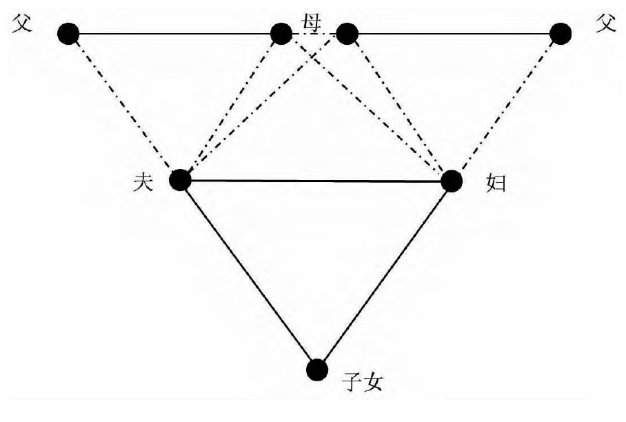 第一,青年夫妇是扩展家庭三角关系稳定的中心和枢纽。在扩展家庭关系模型中,由青年夫妇构成的夫妻关系是整个关系模型的核心和基础。这种核心不仅是结构上的核心,而且也是感情上的核心。28因为在原生家庭基本三角破裂后,来自两个不同原生家庭的青年夫妇组成新家庭,把原本陌生的两个家庭联结在一起。同时,青年夫妇虽然从原生家庭的基本三角中脱离出来,但在感情上依然维持着联系。青年夫妻关系顺理成为扩展家庭关系结构的核心和枢纽。虽然有学者认为,由于新的基本三角是从原生家庭基本三角中派生出来的,所以在扩展家庭结构模型中双方原生家庭是干、青年夫妇构成的家庭是枝。29但是,由于扩展家庭三角结构模型的核心和枢纽是青年夫妇组成的夫妻关系,夫妻关系的稳定性实质上影响着扩展家庭三角关系的稳定性。如果夫妻关系破裂,那么扩展家庭三角关系势必也会分裂。同时,扩展家庭关系也会对夫妻关系稳定性产生直接和间接影响。因此,无论从结构学原理还是从关系学原理来看,夫妻关系都是扩展家庭三角关系的轴心。