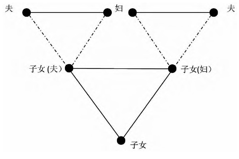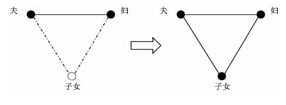 雷蒙德·弗思认为,在舞台上或银幕上,经常会出现两男一女或两女一男的三角爱情故事,这种现象的根源在于,社会结构中真正的三角关系是由父母和共同情操所结合的儿女组成(7)。家庭的三角关系是真正“永恒的三角”。在此基础上,费孝通认为,婚姻的意义就在于建立社会结构中的基本三角关系。夫妇不只是男女之间的两性关系,而且还是共同向儿女负责的合作关系,婚姻关系同时缔结了夫妇和亲子这两种紧密相连的社会关系。在费孝通看来,夫妇关系和亲子关系正如三角形的三条边,缺一不可。在结构学原理那里,任何两点的固定都需要第三个点,只有三点得以确定,家庭三角关系才得以稳定。费孝通实地考察了广西花篮瑶,认为这种三角关系不仅具有结构学基础,而且具有深厚的社会基础。在花篮瑶,夫妇之间虽然缔结婚约,但是这种夫妇关系是不完全的,因为他们只是在三角中两点间画了一条线,还有一点是虚悬的,两边还是虚线。这种三角在创造过程中是一个动态的势,其中蕴含着犹豫和紧张的劲,是一种不稳定的关系。这种三角关系只有到夫妇之间共同孩子的出生才算正式确立(如图1所示),这种确立不仅是在实际生活中,而且是在社会仪式(包括满月仪式、社会称谓)上宣告婚姻关系的完成。(8)