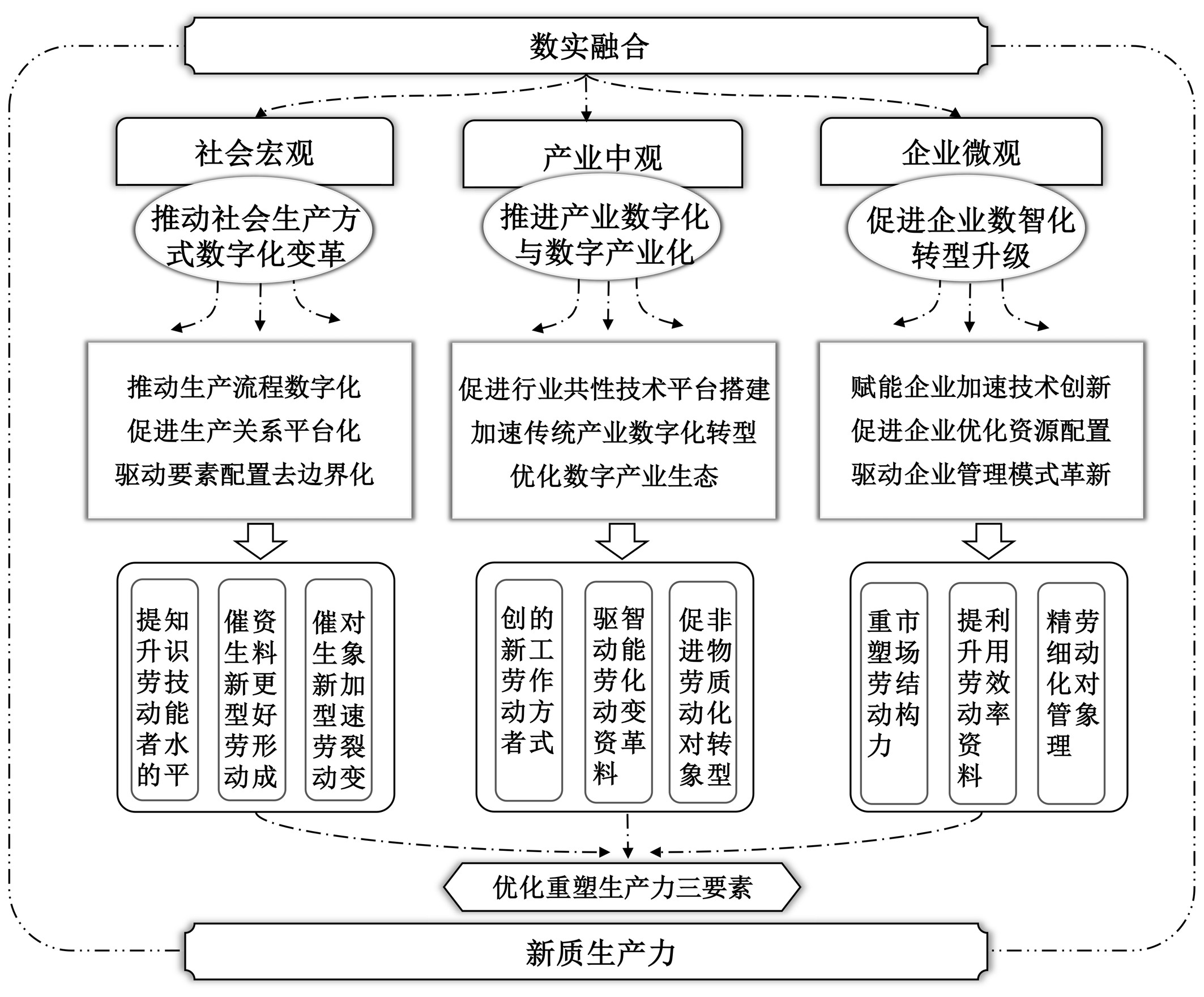 新质生产力是在继承和发展传统生产力基础上形成的、以科技创新驱动为内涵式发展的生产力新形态,能够整合生产关系和社会资源,促进社会经济制度变革。社会生产方式革新是新质生产力的发展基础(李炳炎 等,2024)。在社会宏观层面上,数实融合通过推动社会生产方式数字化变革,提升劳动者的知识技能水平,催生新型劳动资料更好形成,催生新型劳动对象加速裂变。