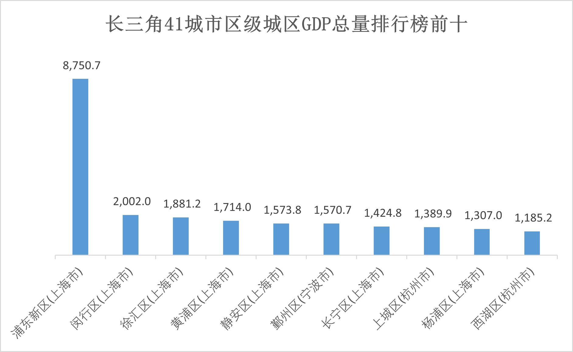 从整体来看,长三角41城市区级城区中,GDP总量排行榜前十分别是:上海浦东新区(8,750.7亿元)、上海闵行区(2,002.0亿元)、上海徐汇区(1,881.2亿元)、上海黄浦区(1,714.0亿元)、上海静安区(1,573.8亿元)、宁波鄞州区(1,570.7亿元)、上海长宁区(1,424.8亿元)、杭州上城区(1,389.9亿元)、上海杨浦区(1,307.0亿元)、杭州西湖区(1,185.2亿元)。上半年共12个区级城区GDP总量超千亿元。