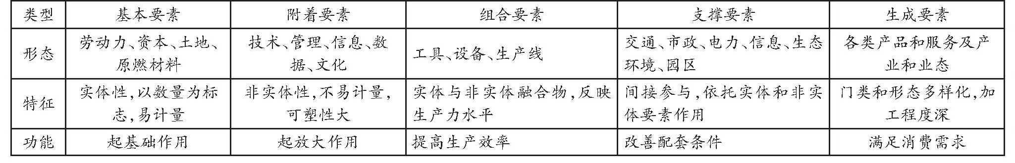 第一,根据生产过程涉及到的要素形态、功能和特征,将按劳动者、劳动资料和劳动对象维度的生产要素,分成基本要素、附着要素、组合要素、支撑要素、生成要素五大类。