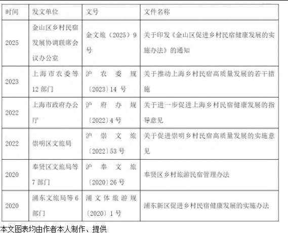 2020年,浦东和奉贤两个区的文旅局分别会同其他相关部门出台了促进乡村民宿健康发展和管理方面的政策文件。随后,2022年3月,上海市政府办公厅出台了促进乡村民宿健康发展的相关指导意见;10月,崇明区文旅局第一个出台了促进乡村民宿高质量发展的政策文件。2023年,上海市农委会同其他相关的11个部门颁布了推动乡村民宿高质量发展的系列措施。2025年金山区乡村民宿发展协调联席会议办公室颁布了民宿健康发展的实施办法。从政策目标看,上海乡村民宿的定位已从“解决农民增收”升级为“繁荣农村经济+提供高品质旅游体验”双重导向,逐步转向“宜居、宜业、宜游的美丽乡村”建设。