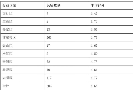 近年来,上海的乡村民宿得到迅速发展。以“民宿”为关键词,我们从携程网上爬取了位于上海的1858家民宿数据,手工整理,剔除非乡村民宿数据后,剩余503家乡村民宿。这些民宿分布在上海的9个区。其中,乡村民宿最多的是浦东新区,有263家;其次是崇明区,有117家;最少的是宝山区和松江区,分别为2家。从携程住客的评分情况来看,平均得分为4.64分,崇明区得分最高,为4.77分;其次是宝山区4.75分;得分最低的是闵行区,为4.46分(表2)。