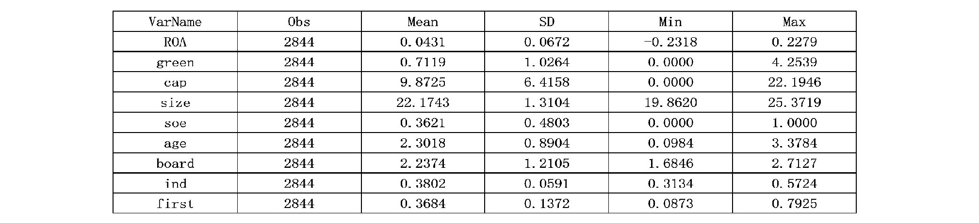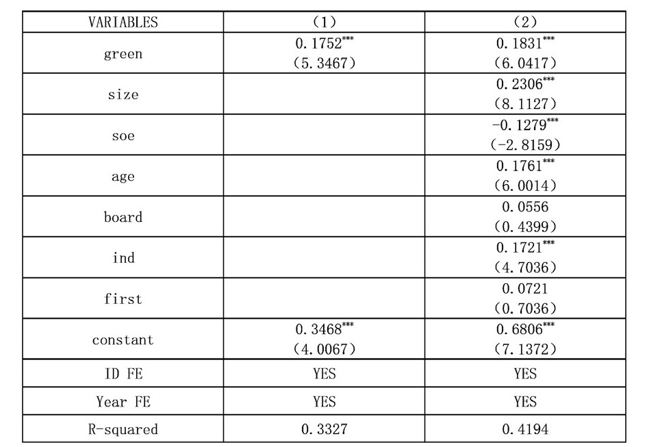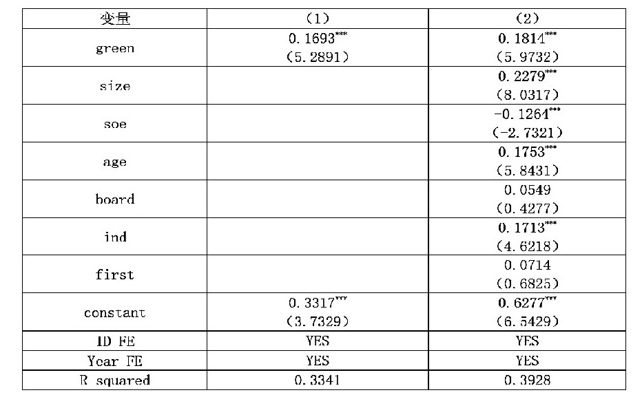 从资产回报率(ROA)来看,样本企业的资产回报率平均值为0.0431,表明整体而言,样本企业的资产盈利能力并不强,且不同企业之间的资产回报率差异较小。在企业绿色技术进步方面,标准差为1.0264,显示出不同企业绿色技术进步方面存在显著差异。管理效率(cap)的平均值为9.8725,标准差为6.4158,表明这些公司在管理效率上有较大的差异。企业规模(size)的平均值为22.1743,标准差较小,为1.3104,说明大多数零售公司的规模相对接近,分布较为均匀。企业年龄(age)的平均值为2.3018,标准差为0.8904,表明这些公司的成立年限有一定的差异。董事会规模(board)的平均值为2.2374,标准差为1.2105,说明不同公司在董事会规模上存在一定的差异。独立董事占比(ind)的平均值为0.3802,标准差较小,为0.0591,表明大多数公司的独立董事占比相对接近。股权集中度(first)的平均值为0.3684,标准差为0.1372,显示出不同零售企业的股权分布存在一定的差异。各个变量的描述性统计结果如表1所示。