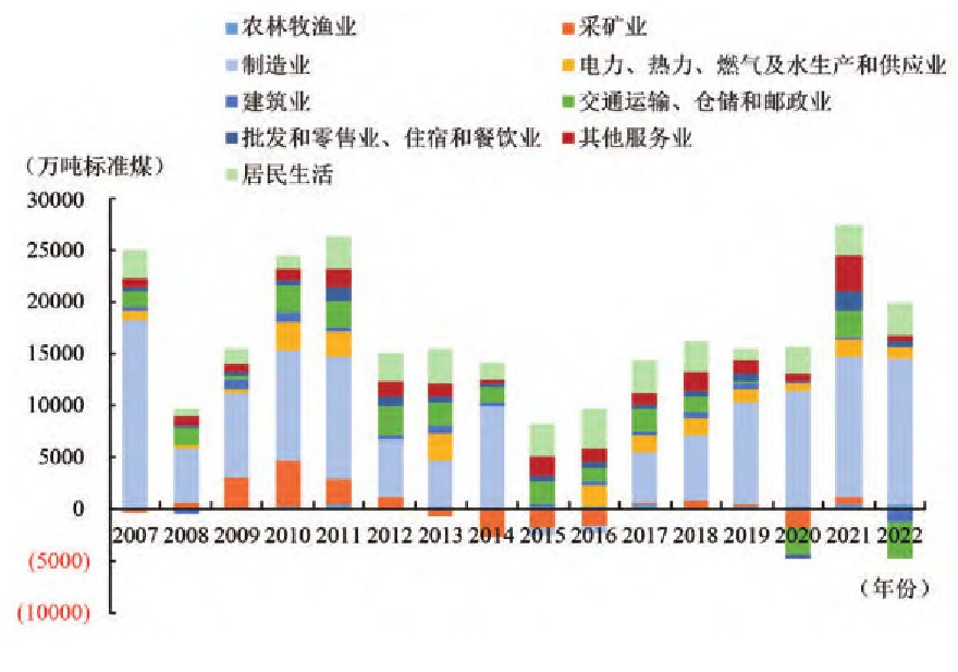 进入“十四五”时期,新能源技术、新一代信息技术等先进技术在新一轮科技革命深入推进过程中不断突破,对我国能源结构和产业结构产生深刻影响。一方面,新能源技术成熟带动非化石能源消费需求上升,加快非化石能源的替代进程。在此基础上我国提出推动能耗双控向碳排放双控制度转变,极大释放了经济发展的用能空间,非化石能源消费对能源消费增量的贡献率越来越高,对能源消费弹性系数的影响也越来越深。另一方面,以人工智能、量子信息为代表的新一代信息技术等前沿技术加速突破应用,成为塑造产业优势的关键基础。然而,新一代信息产业本身的高能耗属性和原材料多来源于传统高耗能产业,其规模扩大导致我国能源需求快速增长。综合来看,产业能源消费需求释放,加上疫情后有效需求不足与产品价格下降等多种因素,共同造成了“十四五”以来我国能源消费弹性系数快速波动上升的趋势。可以预期,在新能源随机性特征无法利用现有技术手段有效解决的情况下,化石能源作为安全保供能源的配比也将被进一步拉动。