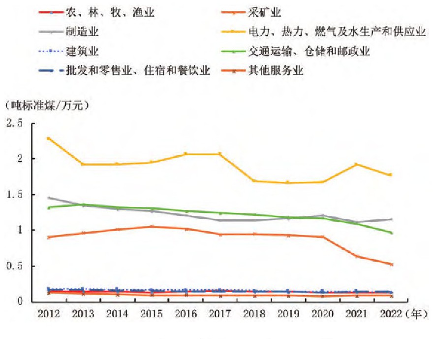 受生产方式、技术工艺和产品特性等因素影响,不同行业的能耗强度存在明显差异,把握这些行业特征才能在推进重点领域绿色低碳转型的过程中做到有的放矢。根据能源统计的行业划分,以及各行业能耗强度平均水平和变化趋势,可将八个行业按能源生产率高低划分为低产出效益行业和高产出效益行业两类(见图3),其中电力、热力、燃气及水生产和供应业,制造业,交通运输、仓储和邮政业,采矿业四部门属于低产出效益行业;建筑业、批发和零售业、住宿和餐饮业、其他服务业属于高产出效益行业。2022年,八个行业能耗强度较2012年均有明显下降,按降幅由高到低依次为采矿业,其他服务业,建筑业,交通运输、仓储和邮政业,电力、热力、燃气及水生产和供应业,制造业,批发和零售业、住宿和餐饮业,农、林、牧、渔业。按能耗强度降低的绝对值排名,由高到低依次为电力、热力、燃气及水生产和供应业,采矿业,交通运输、仓储和邮政业,制造业,建筑业,其他服务业,批发和零售业、住宿和餐饮业,农、林、牧、渔业。结合各行业能源消费规模来看,十八大以来,我国能耗强度的下降主要得益于能源消费占比较高的制造业的能耗强度下降,以及低能耗强度的其他服务业能源消费占比的提升。