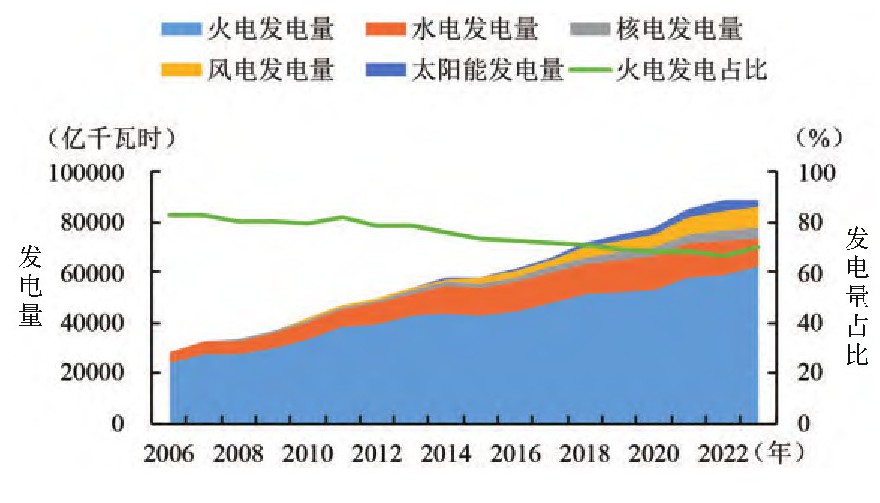 当前,我国已基本形成了煤炭、石油、天然气、可再生能源等多元能源供给体系。煤炭占一次能源消费比重由2011年的70.2%降至2023年的54.5%,天然气、水电、核电、风电、太阳能发电等清洁能源消费占比提升至26.1%,但煤炭占一次能源消费比重占比仍在50%以上。从电力结构看(见图5),近15年来尽管燃煤发电量在全部发电量中的比重持续保持下降趋势,但在2022年仍然占据66.55%,我国能源结构偏煤高碳特征依旧明显。