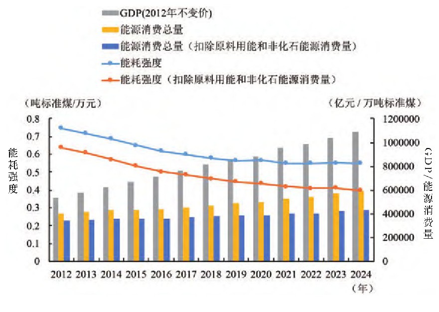 十八大以来,我国深入推动能源安全新战略,即能源消费革命、能源供给革命、能源技术革命、能源体制革命,全方位加强国际合作,能源效率实现大幅提升。2012年至2023年,我国以年均不到3.3%的能源消费增速支撑了年均超6.1%的经济增长,能耗强度实现持续下降(见图2)1。一方面,非化石能源替代大大释放了用能空间,在有效控制化石能源消费的基础上实现了经济产出的增长,2024年我国能耗强度(扣除原料用能和非化石能源消费)较2012年累计下降近37.74%。另一方面,作为原料使用的化石能源占比不断提升。2022年,我国化石能源消费量较“十三五”末增加2.67亿吨标准煤,其中作为化工原料使用的增量占比达到36.41%,较“十三五”提高近9个百分点,较“十二五”提高近14个百分点。2023年,受原料用能减少影响,作为燃料使用的化石能源的增量贡献率回升明显,但占能源消费总量比重仍较2012年下降了近4个百分点。这两组数据表明我国在促进能源效率提升的同时,也推动了能源结构的绿色低碳转型,有效缓解了碳达峰碳中和目标对经济发展能源需求的约束压力。