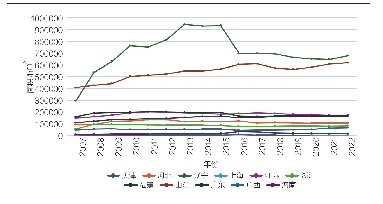 图2 沿海地区各省(区、市)海水养殖面积(2007—2022年)
