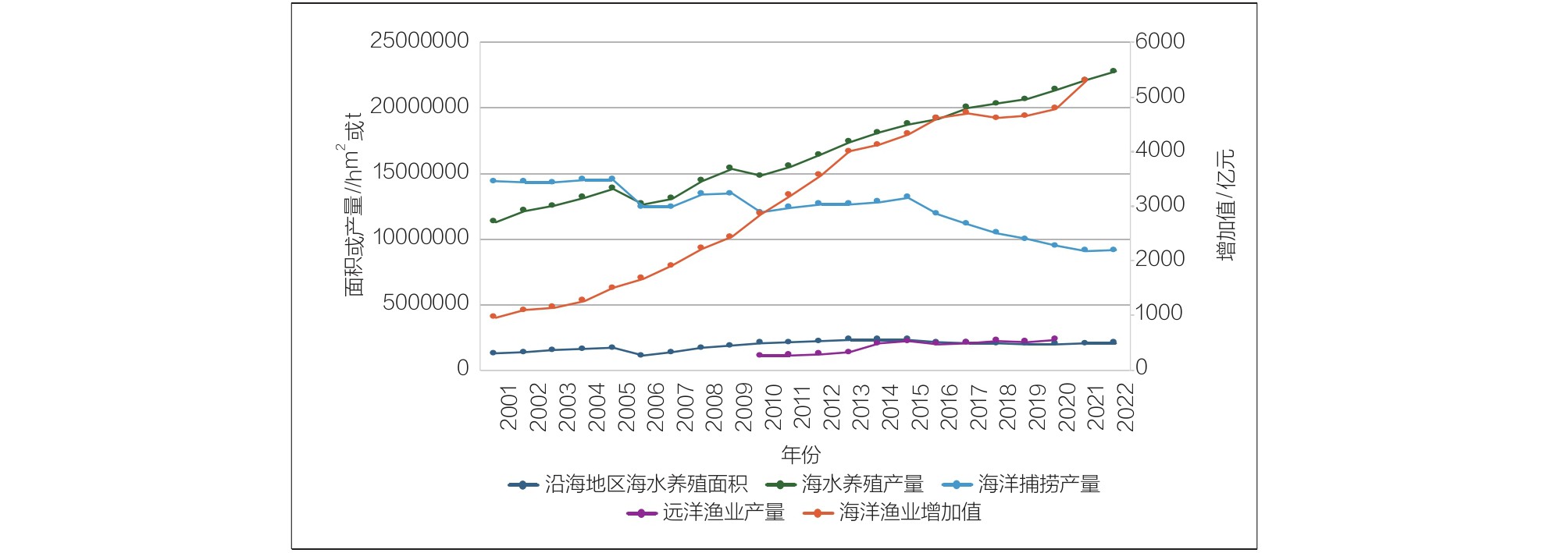 图1 我国海洋渔业产业和资源发展状况(2001—2022年)