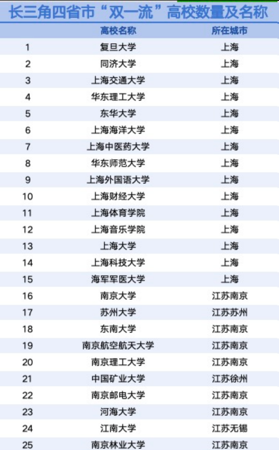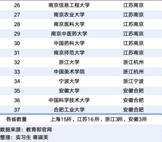 21世纪经济报道梳理发现,在第二轮“双一流”建设高校及建设学科名单中,长三角共有37所高校入选,占目前“双一流”高校数量的四分之一,其中上海有15所,江苏有16所,浙江有3所,安徽有3所。